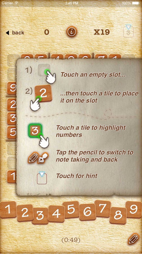 In ▻Sudoku, you win a game when you solve a puzzle with 3 errors or less (we used this threshold to give a bit of slack for mis-tapping :) Also, you have a number of hints to help you play (more at the easy, less at the hard level). To fit any taste, you can choose between a lush tile look or a more classic board look :)